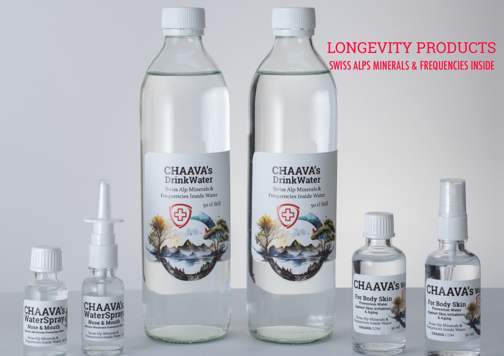 CHAAVA´s LONGEVITY Wasser stammt aus den Schweizer Alpen auf über 2.000 Metern Höhe. Es vereint >>reichhaltige Mineralien und Frequenzen. Daher ist es eine echte vorbeugende Massnahme gegen chemische Verkalkung im Körper. Wir nennen dies das Phänomen der „EMERGENZ“.