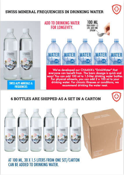 Wir haben CHAAVA's „DrinkWater“entwickelt, von der jeder profitieren kann. Die Grunddosierung ist schnell und einfach! Sie können 100 ml in 1,5-Liter-Trinkwasserflaschen hinzufügen. Bei körperlichen Beschwerden können Sie 2 x 100 ml in Ihr Trinkwasser hinzufügen. Bei chronischen Erkrankungen oder Beschwerden empfehlen wir, das Wasser pur zu trinken. IM SET/KARTON SIND 6 x 500 ml DRINKWATER ENTHALTEN. BEI 100 ML, KÖNNEN 30 x 1,5 LITER AUS EINEM SET/KARTON DEM TRINKWASSER BEIGEGEBEN WERDEN.